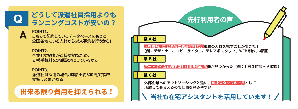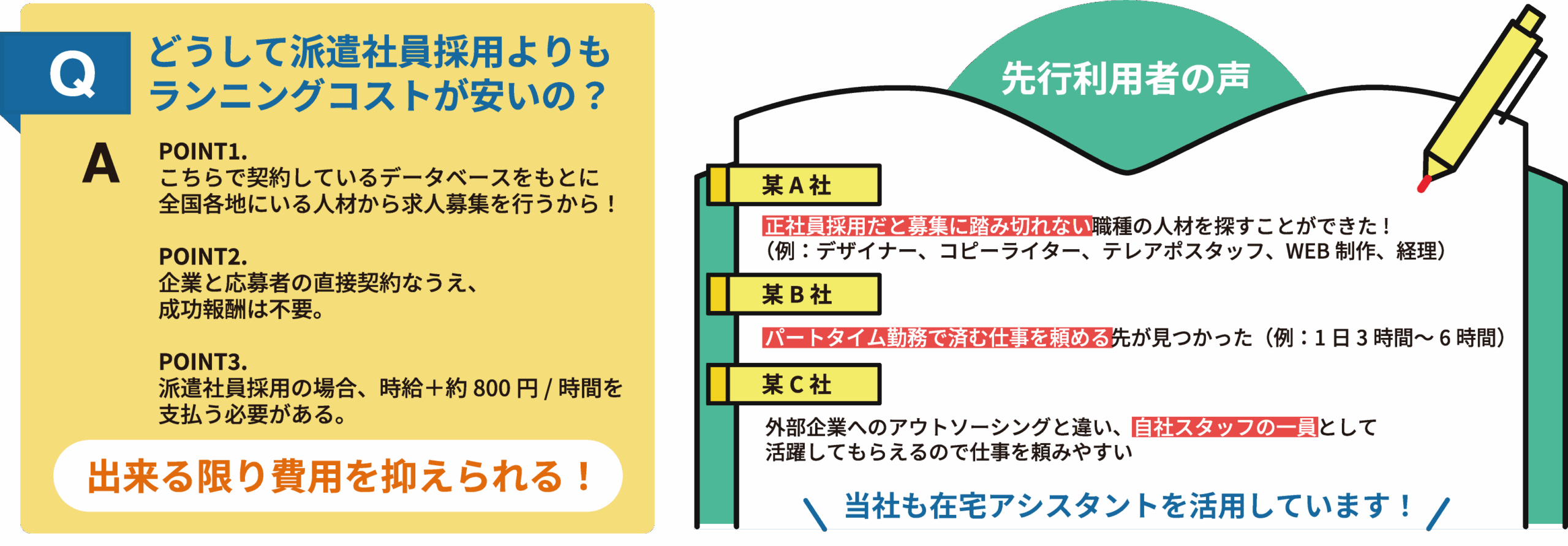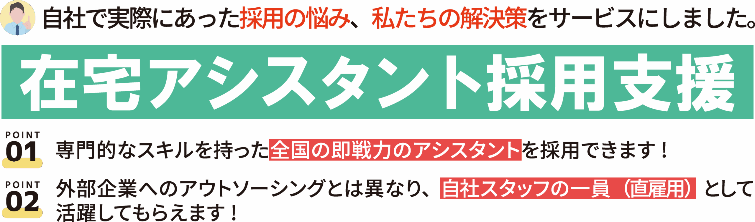 社内業務をお任せできる在宅アシスタントの採用支援サービスです。人材不足など経営におけるお悩みを解決へと導きます。
